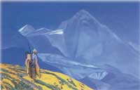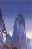 «Майтрейа». Многие гималайские этюды построены по тому же принципу: коричневые угрожающие массивы на переднем плане сменяются полупрозрачной голубизной, синевой, лиловизной, белизной уходящих в даль воздушных и радостных очертаний гор. Причем можно даже датировать появление этой гаммы в творчестве художника, совпадающее с этапами его духовного пути и, в прямом смысле, с изменениями состояния его организма. Иногда передний план картин (чаще всего пейзажных, но не реалистических, а символических) у Рериха – черный или почти черный, непроницаемый, в нем ничего не видно, а затем – выше, дальше по пути – цвет становится все светлее и прозрачнее, формы тоньше, т.е. тайный потенциал реализуется, раскрывается, познается.