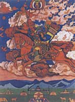 Очень интересна картина «Великий Всадник» с образом Майтрейи, грядущего освободителя человечества, сделанная в стиле тибетских танок в красно-зеленой гамме с синими вкраплениями, которую можно было бы назвать в контексте нашего разговора гаммой сердечного действия под руководством интуиции, т.е. внутреннего знания, высшего по отношению к знанию внешнему.